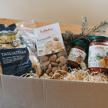 Enthält je einmal Salsa Pronta, Tagliatelle bioladen, Amaretti und Pesto mit Chili und Blüten.