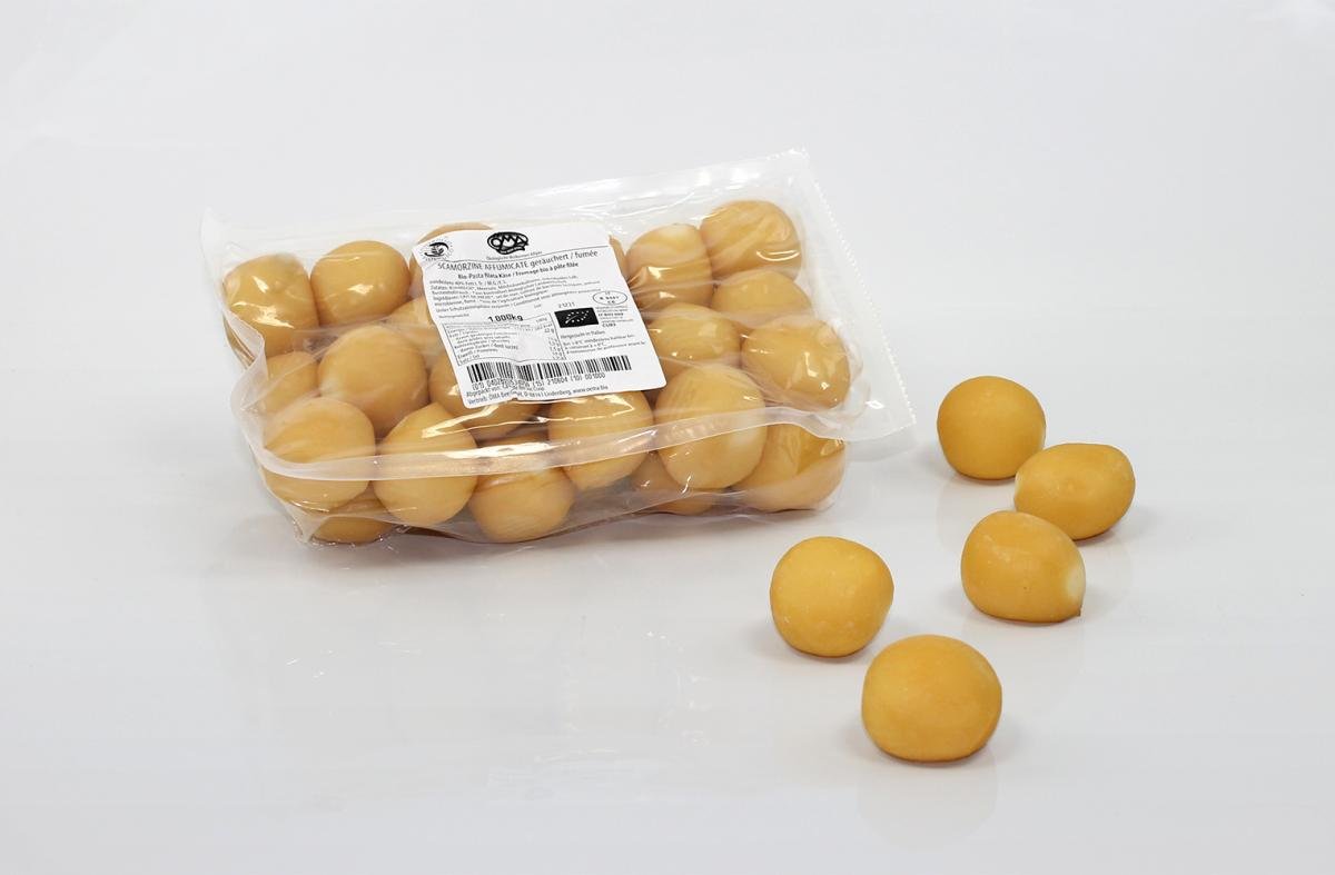 Scamorza gehört wie Mozzarella zur Familie der ''Filata-Käse'' (Brüh- und Knet-Käse). Nach dem Herstellungsprozess werden die birnenförmigen ÖMA Scamorza Affumicata paarweise aufgehängt und ca. 3 Tage lang gereift. In dieser Zeit bildet der Käse eine leichte Rinde aus und erhält durch die im Anschluss erfolgende, schonende Räucherung über Buchenholz eine leicht rauchige Geschmacksnote. ÖMA Scamorza Affumicata ist eine echt italienische Spezialität mit der Eigenschaft, nicht nur gut zu schmecken, sondern auch ein Blickfang für jede Käsetheke zu sein. Präsentieren Sie diesen ertragsstarken Augen- und Gaumenschmaus unbedingt hängend in Ihrer Theke! Verkauft werden Sie entweder im Ganzen - um die dekorative Wirkung zu erhalten - oder vertikal halbiert bzw. geviertelt. ÖMA Scamorzine Affumicate sind die kleinen Schwestern unserer beliebten ÖMA Scamorza Affumicata und - passend zu ihrer Größe - zart und mild im Geschmack. Vor mehr als 30 Jahren haben sich Kleinbauern in der Region Venetien zu einer Landwirtschaftskooperative zusammengeschlossen, um der Industrialisierung in der Landwirtschaft entgegenzuwirken und ihre traditionell kleinstrukturierten Betriebe zu erhalten. Mit dem gleichzeitigen Verzicht auf Pestizide und chemische Düngemittel und der artgerechten Tierhaltung stellte die Kooperative damals schon auf die ökologische Wirtschaftsweise um. Heute werden das über Jahrzehnte gesammelte Wissen und die Erfahrung mit moderner Technik gepaart, um Produkte der Spitzenklasse zu produzieren. Die frische Bio-Milch, die ausschließlich von den Mitgliedern der Kooper