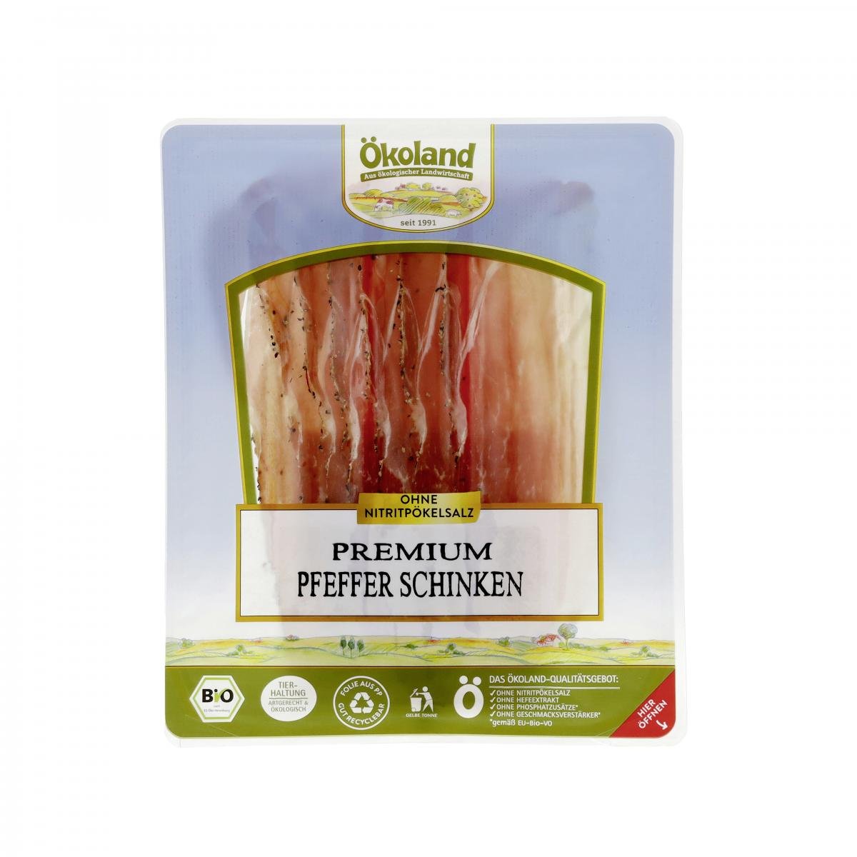 Über 4 Monate im handwerklichen Naturreifeverfahren ohne Nitritpökelsalz gereift und mit Pfeffer gewürzt, entwickelt der Ökoland Premium Pfefferschinken seinen unverfälschten und pikanten Geschmack. Nur bester Schweineschinken wird hierfür verarbeitet, alles unter strengen Qualitätskontrollen. Bioland-zertifiziert. Ohne Nitritpökelsalz und andere Zusatzstoffe hergestellt. Von Natur aus glutenfrei, laktosefrei, natürliche Hefenbildung durch Fermentation. Innovative Verpackung aus Polypropylen (PP) bewirkt hohe Recyclebarkeit für die Kreislaufwirtschaft von Verpackungsmaterialien.