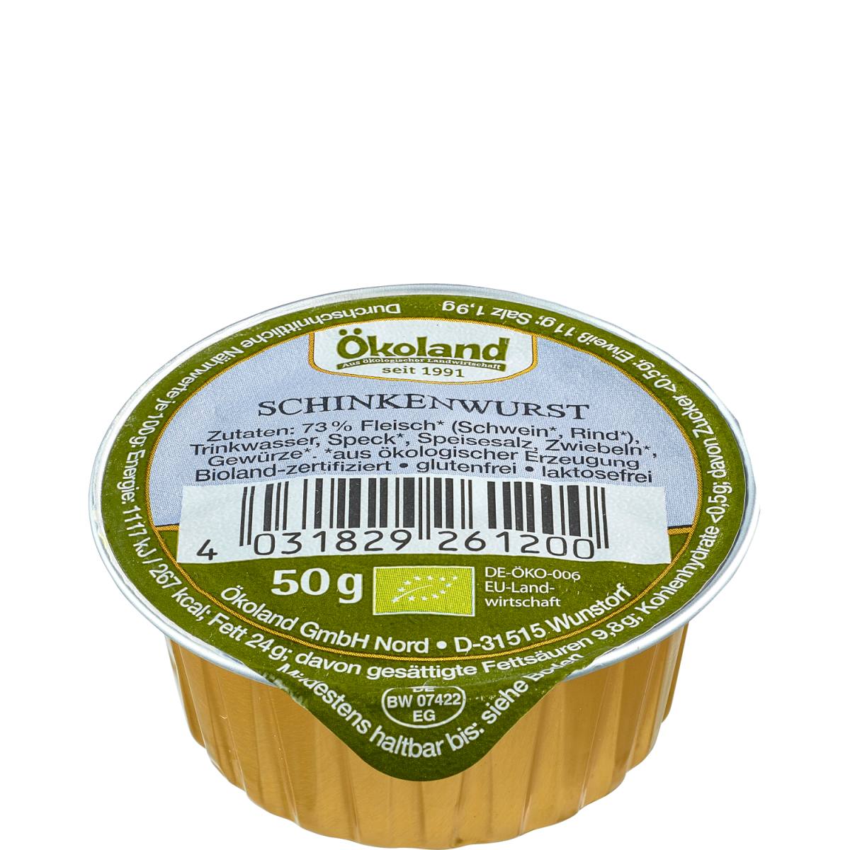 Die Ökoland Schinkenwurst wird aus reinem Bio-Schweinefleisch in Gourmet-Qualität hergestellt. Feine Gewürze runden den Geschmack ab. Die Wurst ist schnittfest mit leichter Jusbildung besonders saftig. In der kleinen Portionsdose lässt sich die Wurst handlich bevorraten und ist für Flexitarier- oder Single-Haushalte perfekt geeignet. Ohne Zusatzstoffe und ohne Zugabe von Aromen und Zucker hergestellt.