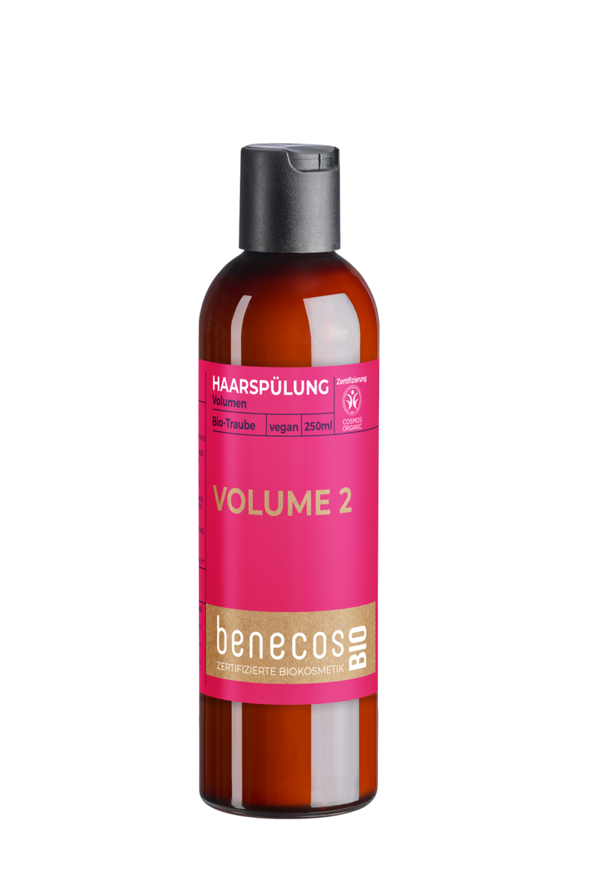 Volumen-Spülung mit Bio-Traubenkernöl, Bio-Apfelsaft und Krambe. Macht das Haar leichter kämmbar und schenkt ihm Volumen. Dermatologisch getestet.