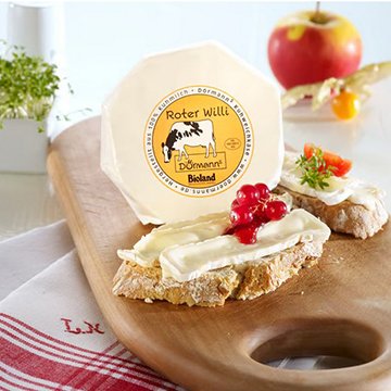 von Hand geschöpfter handwerklich hergestellter Kuhcamembert mit einem leichten Camembert-Schimmel und einer kräftigen Rotkultur geschmiert. Das Aroma ist fein-buttrig und Pikant im Abgang.
