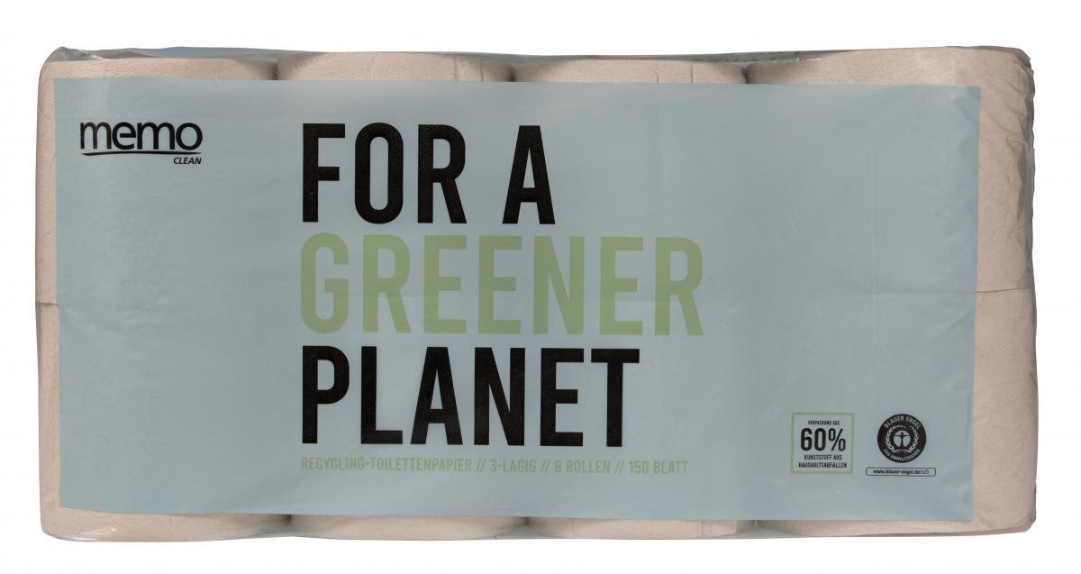 Toilettenpapier der Marke memo zeichnet sich durch höchste Qualität sowie hervorragende ökologische Eigenschaften aus. Es besteht zu 100 % aus recycelten Papierfasern und ist mit dem Blauen Engel ausgezeichnet.