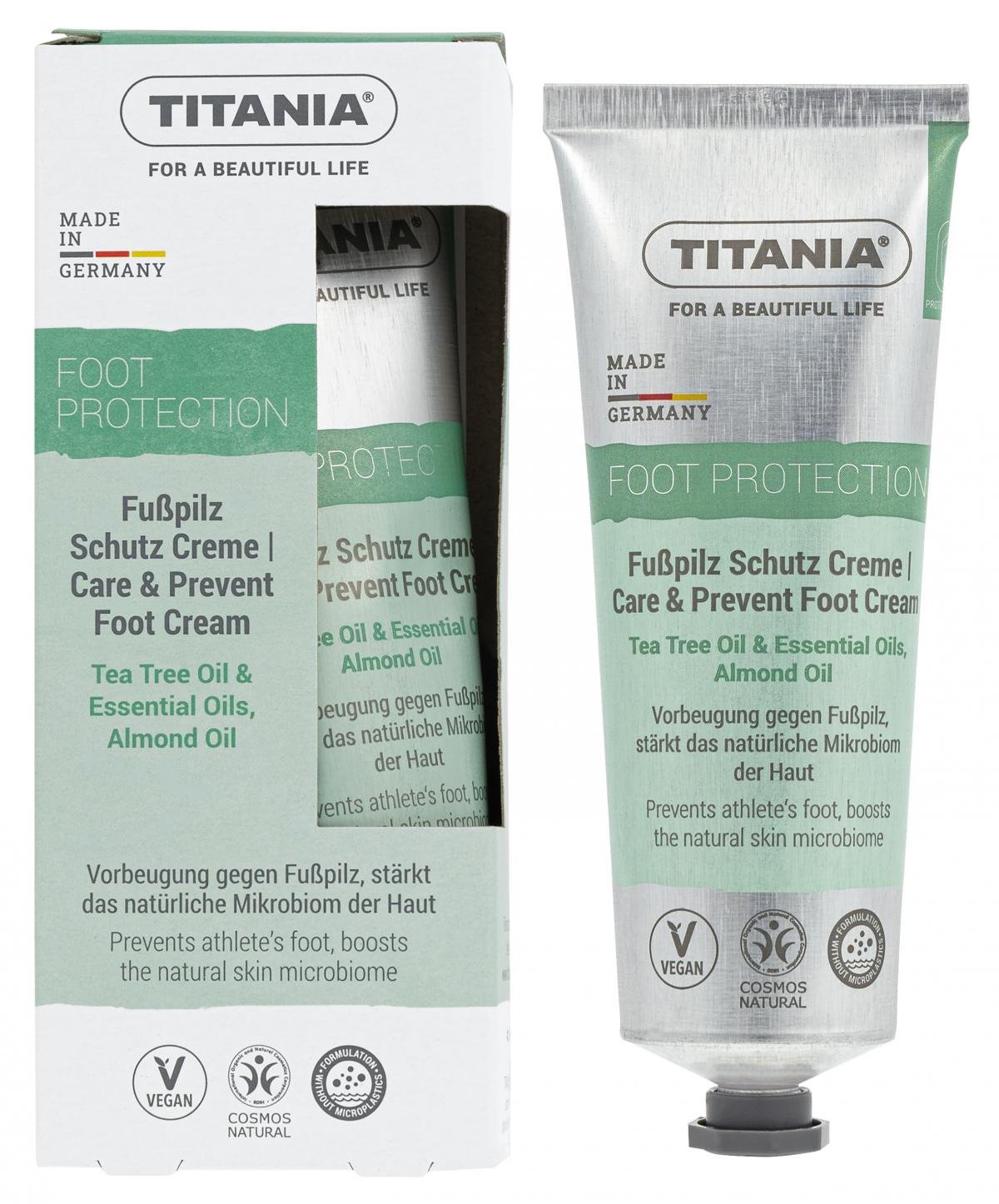 Die TITANIA® Fußpilz Schutz Creme mit ätherischen Ölen aus Teebaum, Rosmarin, Pfefferminze und Eukalyptus kann bei regelmäßiger Anwendung zur Vorbeugung gegen Fußpilz beitragen. Präbiotika helfen, das Mikrobiom der Haut ins Gleichgewicht zu bringen und machen sie widerstandsfähiger gegen Umwelteinflüsse. Mandelöl pflegt die Haut zusätzlich. Anwendung: Regelmäßig und bei Bedarf zweimal täglich auf die gereinigte Haut auftragen und leicht einmassieren.