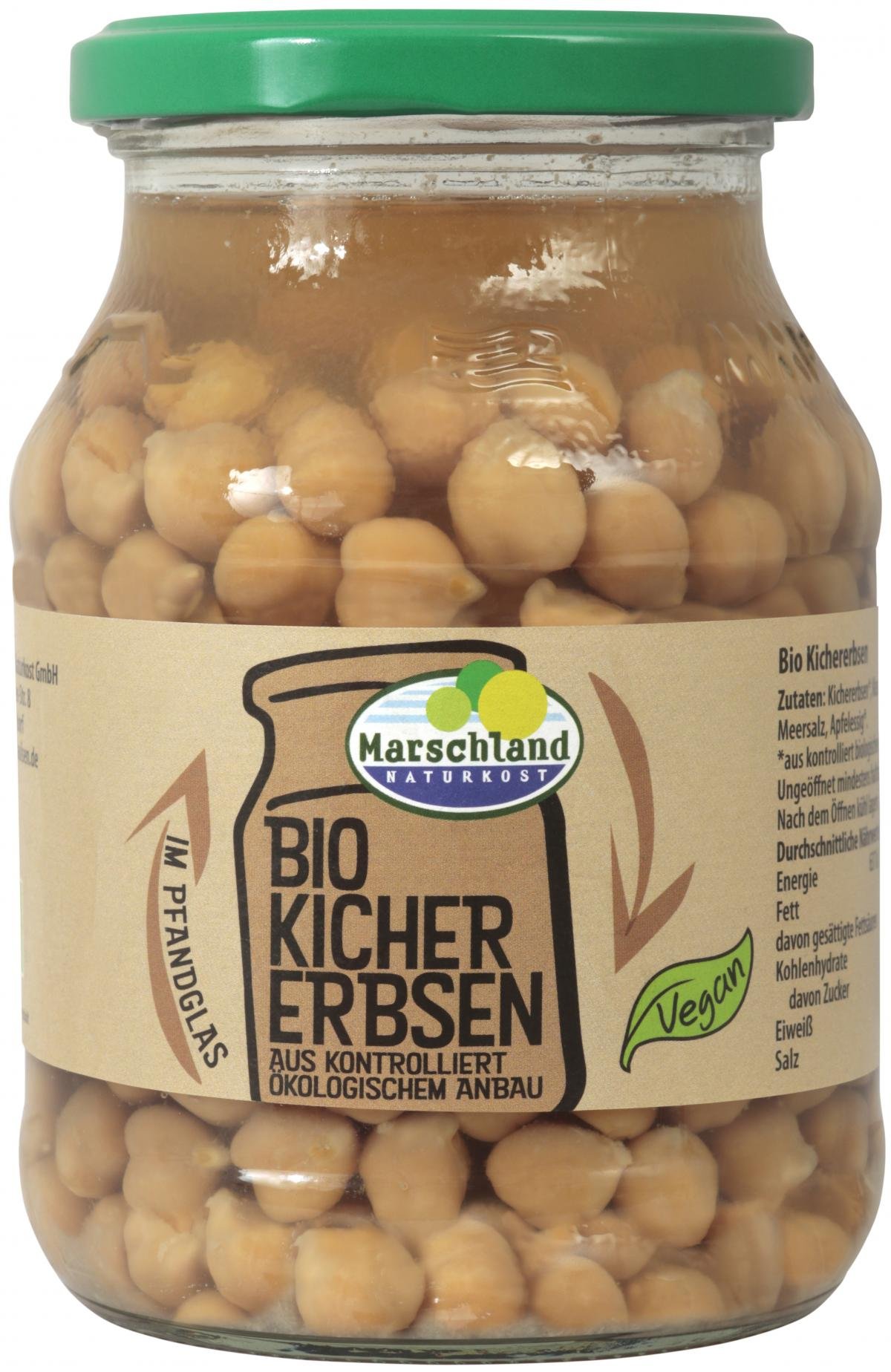 Tafelfertig zubereitete biologische Kichererbsen, die durch Zusatz eines süßsauren Aufgusses und durch Sterilisation im luftdicht verschlossenen Behältnis (Pfandglas) dauerhaft haltbar gemacht worden ist.