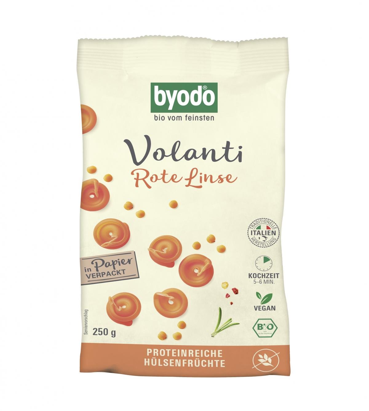 Rund, rot und revolutionär lecker schmecken die Volanti aus roten Bio-Linsen im Byodo Sortiment. Neben wertvollem. pflanzlichen Eiweiß enthalten die feinen, glutenfreien Bio-Nudeln auch jede Menge Ballaststoffe und sättigen auf köstliche Art langanhaltend. Pro Portion rechnet man nur 50 - 60g der leuchtend roten Nudeln.
