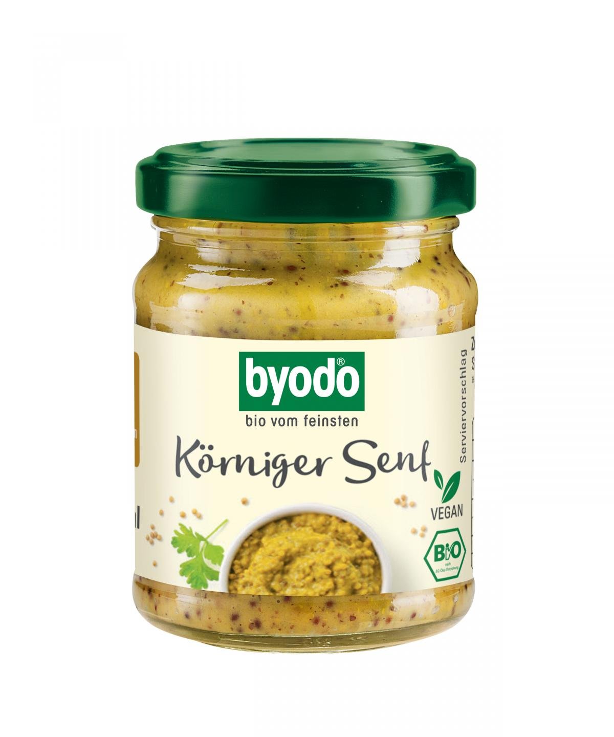 Knackige ganze Senfkörner und cremiger mittelscharfer Senf verbindet der Körnige Senf von Byodo. Aus 100% Bio-Zutaten, köstlich vielfältig!