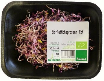 Unsere Bio-Rettichsprossen sind knackig-frisch mit einem scharf-würzigen Geschmack. Durch die ätherischen Öle sind die Rettichsprossen leicht scharf.