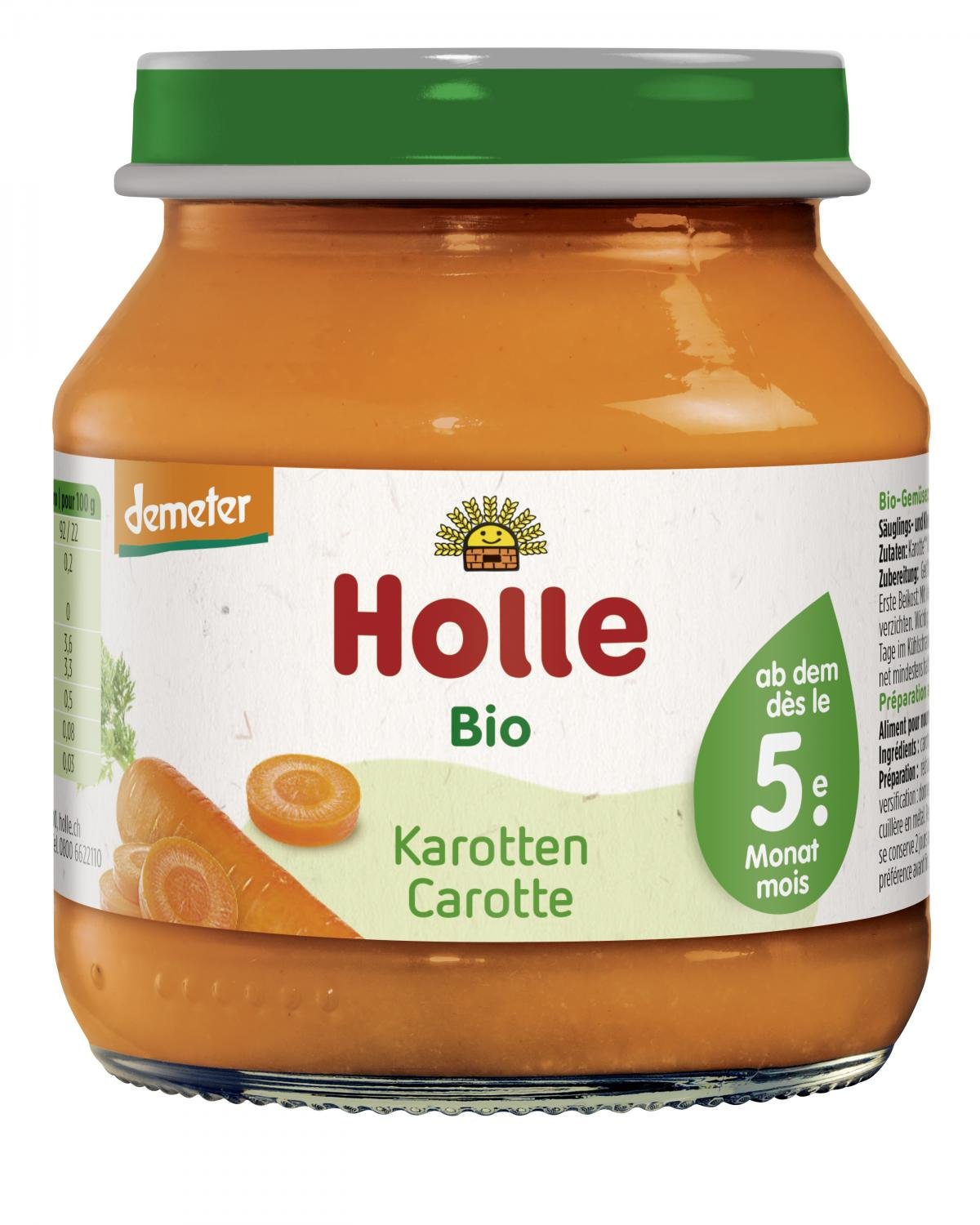 Das Babygläschen Karotte pur eignet sich besonders um mit der Beikost zu starten. Der pure Karottenbrei ist fein püriert und nur beste Demeter-Zutaten aus streng kontrolliertem Anbau werden für die Holle Gläschen verwendet.