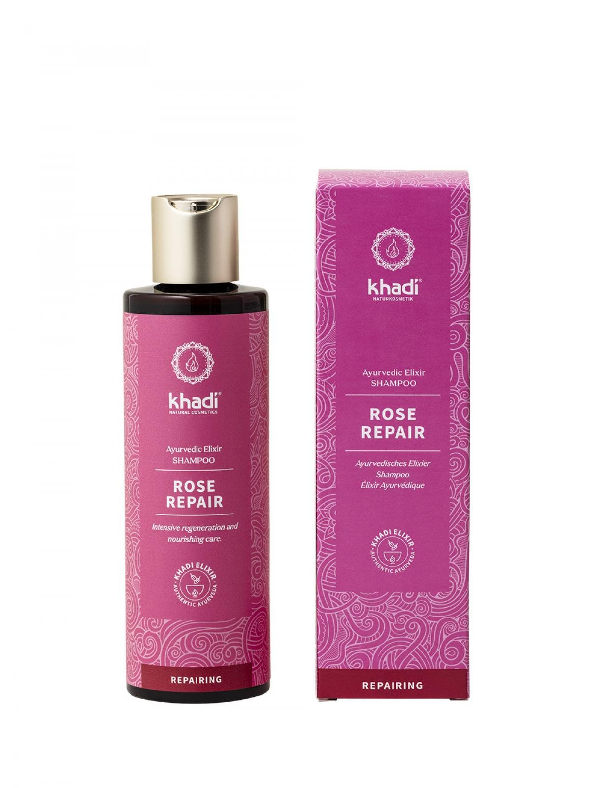 khadi Rose Repair Ayurvedisches Elixier Shampoo verhilft Deinem Haar zu natürlicher Gesundheit und Elastizität. Das Geheimnis der magischen Wirkung beruht auf dem khadi Rose Repair Elixier. In diesem Ayurvedischen Pflanzenextrakt vereint sich die individuelle Wirkkraft handverlesener indischer Heilkräuter zu einem Ganzen und potenziert sich. Das khadi Rose Repair Elixier wird nach altüberlieferten Ayurvedischen Rezepturen in einem traditionellen Verfahren schonend über offenem Feuer hergestellt und entfaltet dabei sein reparierendes Wirkungsgeheimnis.