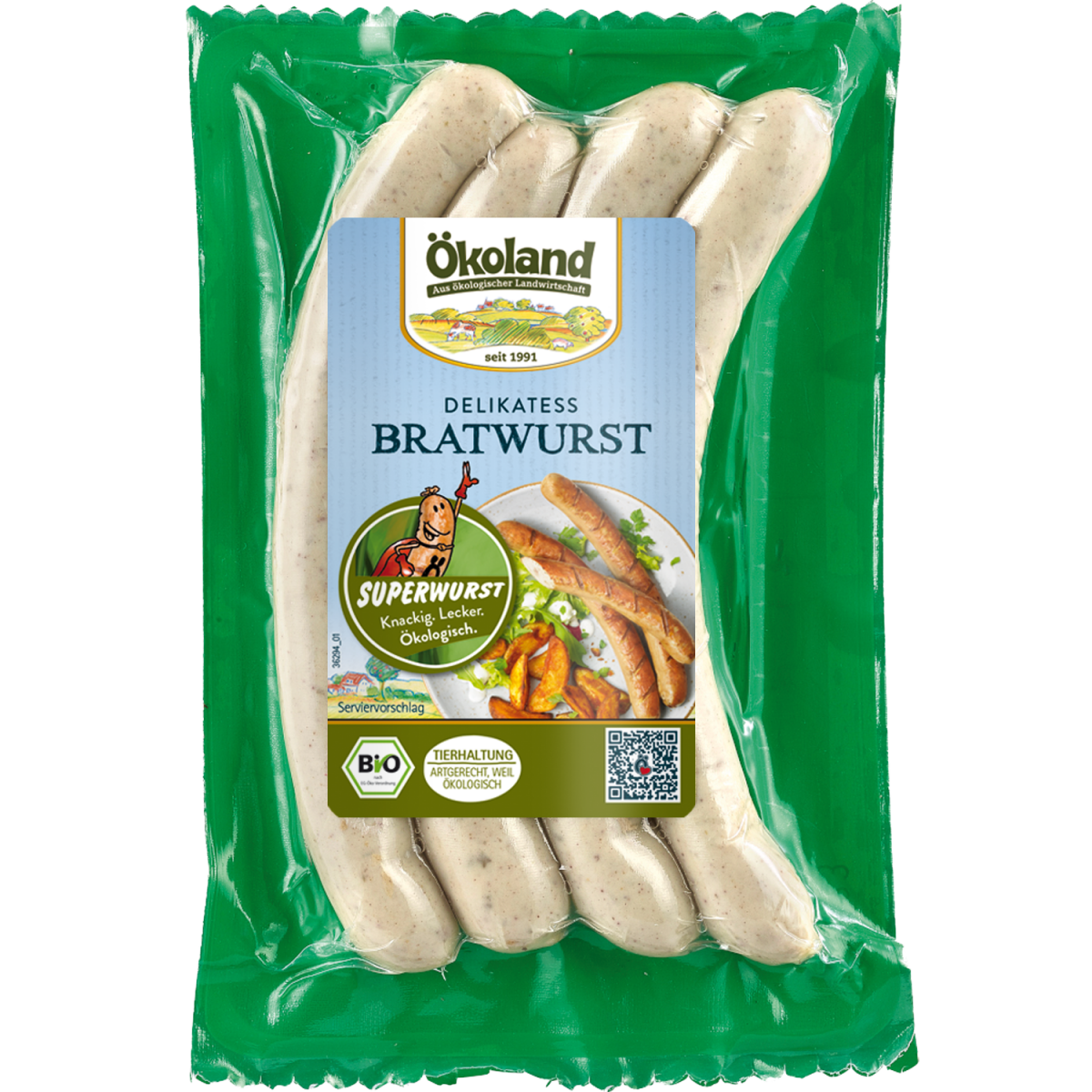 Heiße Leckereien: die Ökoland-Bratwurst wird aus bestem Bio-Schweinefleisch hergestellt. Die feine Rezeptur aus Gewürzen und Kräutern sorgt für den hervorragenden Geschmack. Ohne Zusatzstoffe. SUPERWURST - knackig, lecker, ökologisch.
