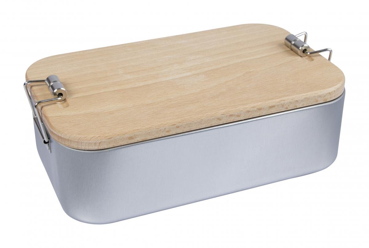 - aus Weichblech mit abnehmbarem Deckel aus FSC-zertifiziertem Buchenholz, der als Brotzeitbrettchen verwendbar ist