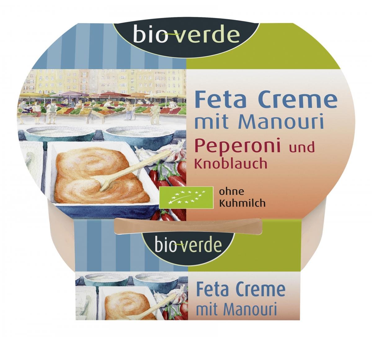 Bei der Feta-Creme mit Manouri handelt es sich um eine streichfähige, geschmacksintensive Käse-Creme aus Schaf- und Ziegenmilch, die mit Knoblauch und Peperoni verfeinert wird.