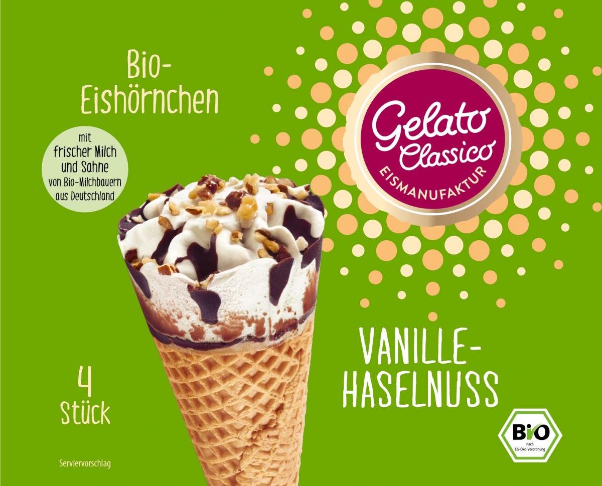 VOLLMILCHPULVER* 29%, SAHNE* 18%, Waffelhörnchen* 16% (WEIZENMEHL*, Zucker*, Palmfett*, Emulgator [SOJALECITIHINE*], Salz, Karamellzuckersirup*), kakaohaltige Fettglasur* 16% (Kokosfett*, Rohrzucker*, Palmöl*, Kakaopulver*, MAGERMILCHPULVER*, Emulgator [Sonnenblumenlecithine*]), Rohrohrzucker*, MAGERMILCHPULVER*, EIGELB*, Glukosesirup*, HASELNUSSMARK* 1%, geröstete HASELNUSSSTÜCKCHEN* 1%, Stabilisatoren (Johannisbrotkernmehl*, Guarkernmehl*), Bourbon Vanilleextrakt*.