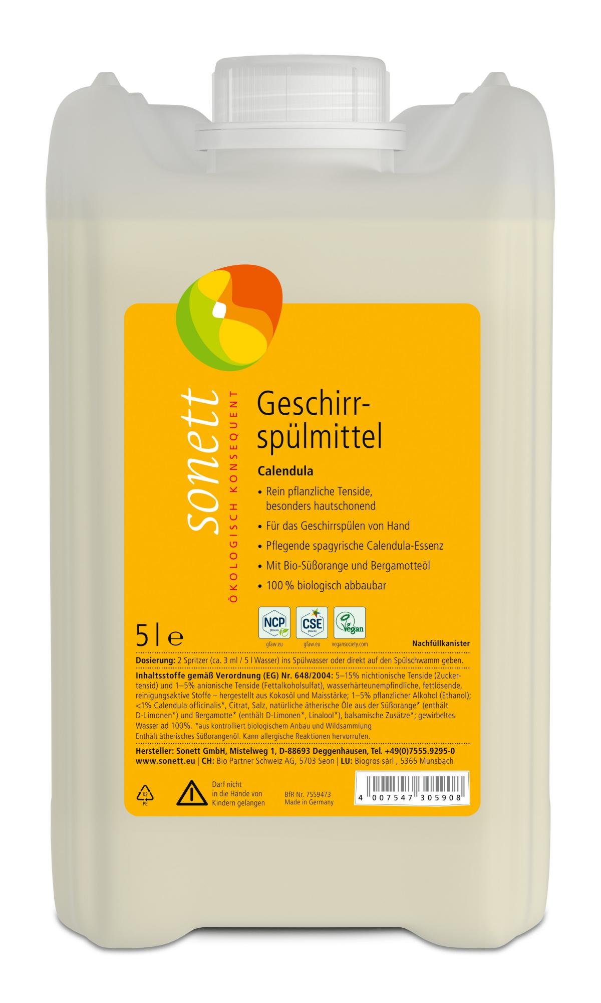 Pflegende spagyrische Bio-Calendula-Essenz in Verbindung mit einer hautverträglichen Tensid-Kombination und dem warmen Duft nach Süßorange aus Bioanbau bilden den ganz besonderen Charakter des Sonett Geschirrspülmittels Calendula. Es ist ein hoch konzentriertes Produkt und daher sehr ergiebig im Gebrauch. Die verwendeten Tenside Fettalkoholsulfat und Zuckertensid sind zu 100 % biologisch abbaubar.