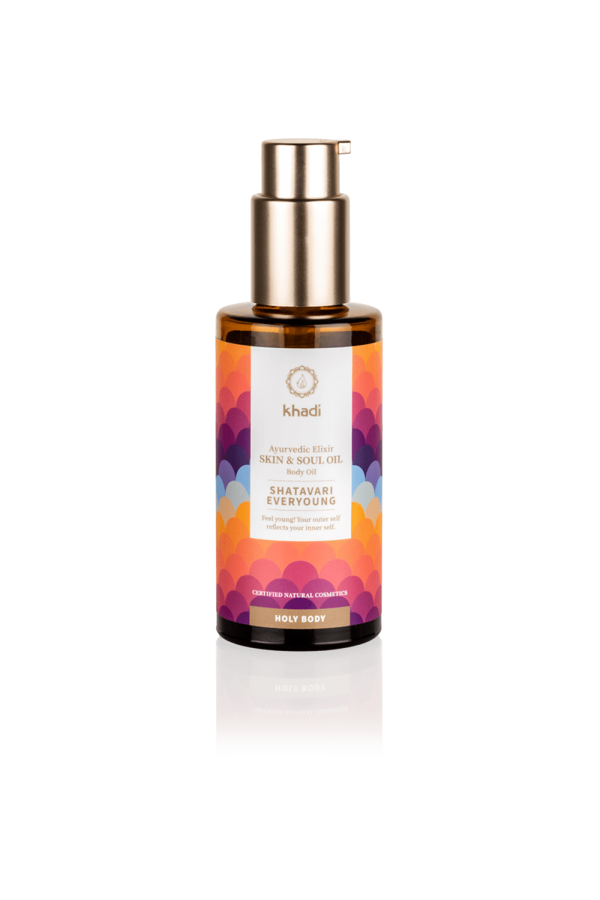 khadi Shatavari Everyoung Elixier Körperöl: Ewige Jugend für Deine Haut - von innen nach außen. Verjüngung wird im Ayurveda mit dem Begriff Rasayana beschrieben. Rasa bedeutet nährende Essenz und Ayana ist der Weg durch verschiedene Kanäle. Jugendlichkeit, bzw. das Verlangsamen des Alterungsprozesses, beginnt im Ayurveda tief in den Zellen. Der Ayurveda gilt als erste Anti-Aging-Medizin der Menschheit. Von diesem uralten Wissen profitiert auch dieses intensive Anti-Aging-Öl.