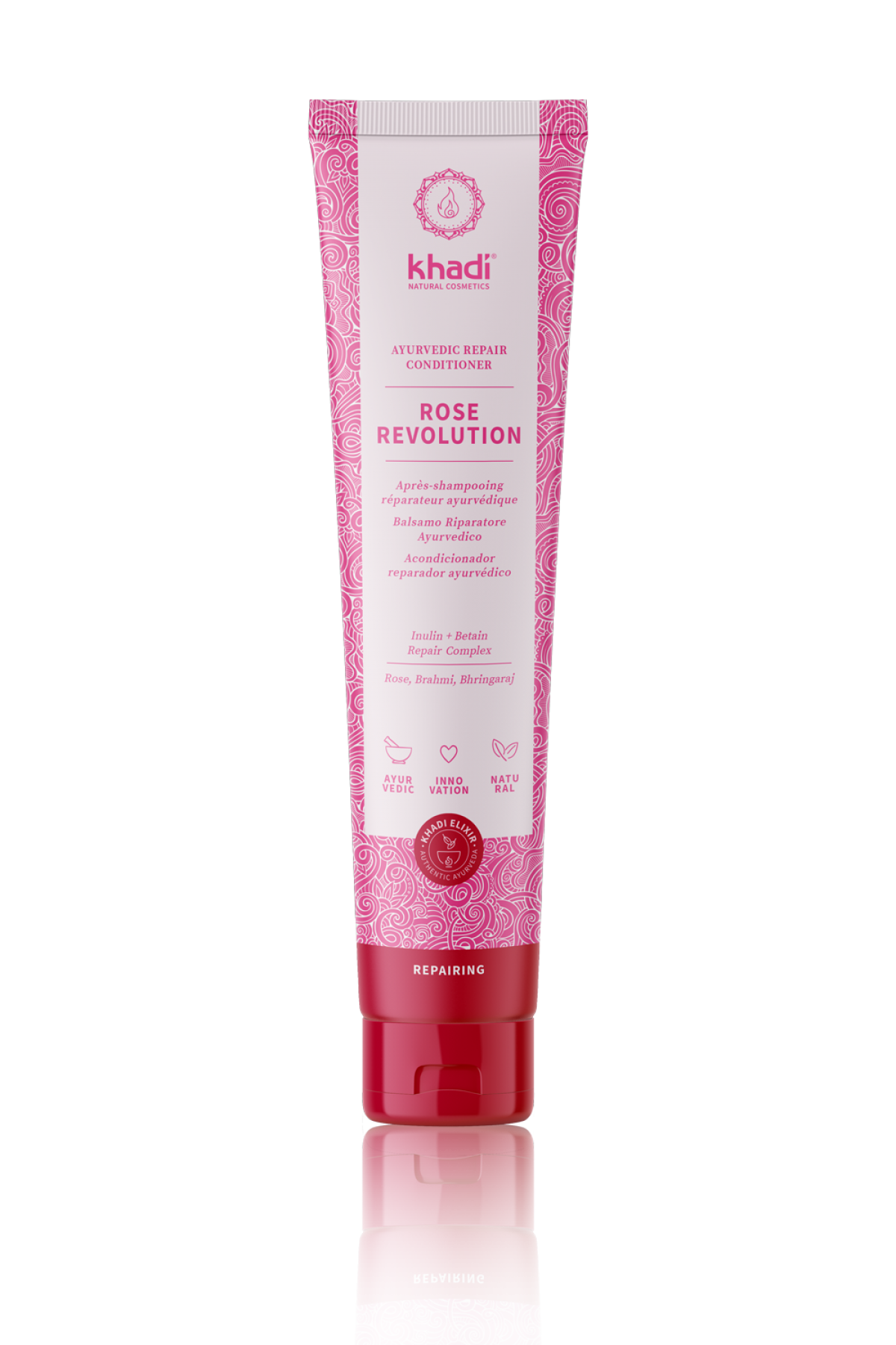Mit dem Ayurveda-basierten Rose Revolution Repair Conditioner kombiniert khadi die Kraft des Ayurveda mit Haarpflege auf dem neuesten Stand der Forschung. Dabei wirkt der neu entwickelte Inulin-Betain-Repair-Komplex in Verbindung mit dem khadi Rose Elixier, einem original Ayurvedischen Konzentrat, das nach altüberlieferter Tradition aus handverlesenen indischen Heilkräutern, wie Amla, Brahmi, Bhringaraj sowie wertvollen Rosenblüten gewonnen wird. Seine nachhaltig pflegenden Eigenschaften beruhen auf der Ayurvedischen Philosophie, die besagt, dass gesundes Haar immer mit der Balance aus innerer und äußerer Schönheit zusammenhängt.