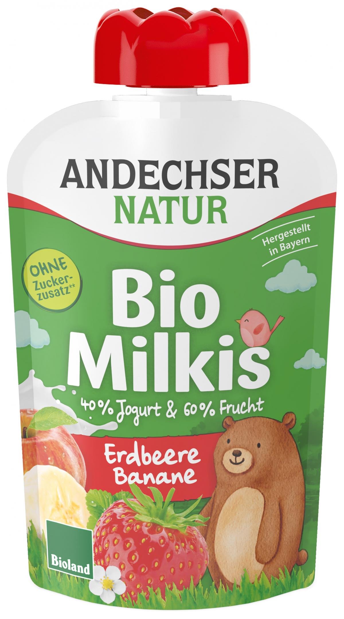 40% FETTARMER JOGURT MILD*, 27,5% Bananenmark*, 17,5% Apfelmark*, 15% Erdbeermark*.