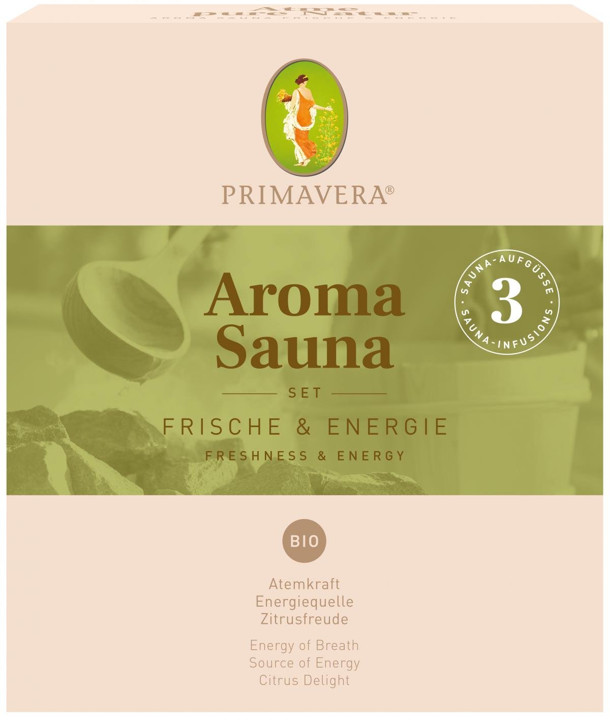 Set mit drei Aroma Sauna Aufgüssen zum Ausprobieren. Inhalt: Atemkraft Aroma Sauna bio 10ml, Energiequelle Aroma Sauna bio 10ml, Zitrusfreude Aroma Sauna bio 10ml