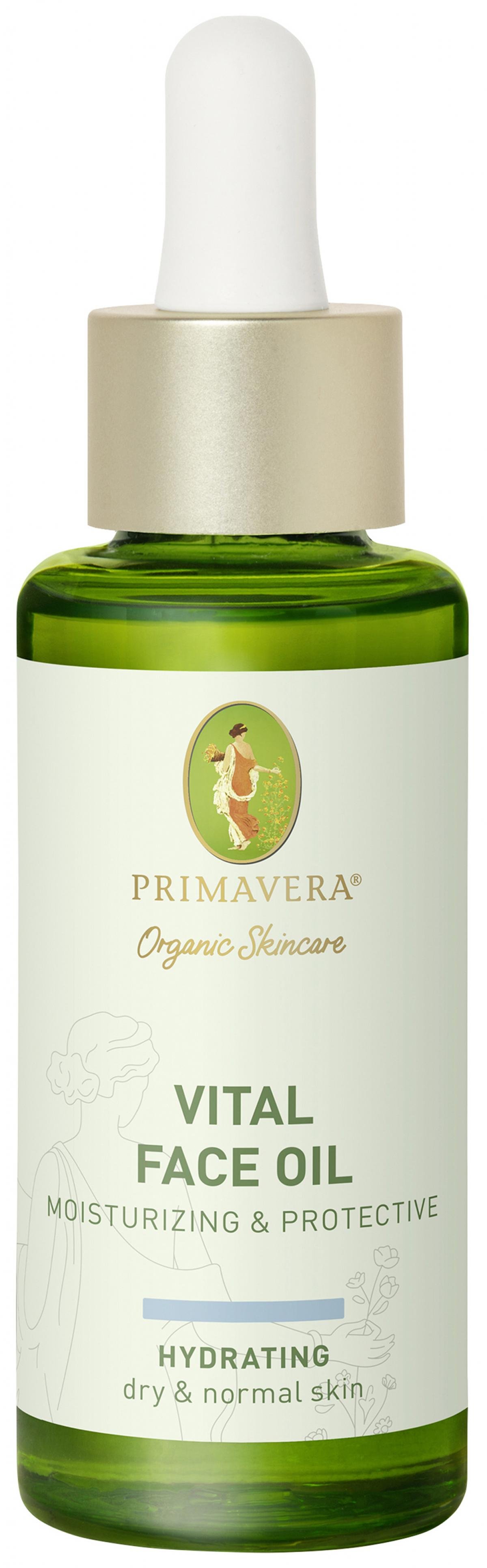Pure Pflanzenkraft und wertvolle Öle machen das PRIMAVERA Vital Face Oil - Moisturizing & Protective zum wertschätzenden Geschenk an unsere Haut. Das Gesichtsöl für normale bis trockene Haut ist wirkungsvoller Bestandteil unserer natürlichen Gesichtspflege. Dank ausgewählter Pflanzenessenzen in einer einzigartigen Komposition erhöht es intensiv die Feuchtigkeit der Haut und schenkt ihr mehr Elastizität und Vitalität. Die pure Wirkkraft von naturreinem Bio Cassissamenöl, Himbeersamenöl und Himalaya Rosenkirschöl lässt unseren Teint erstrahlen. Das PRIMAVERA Vital Face Oil - Moisturizing & Protective aktiviert unsere natürliche Hautbarriere, und dank seiner schnell einziehenden Textur sorgt es unmittelbar für ein vitales Erscheinungsbild.