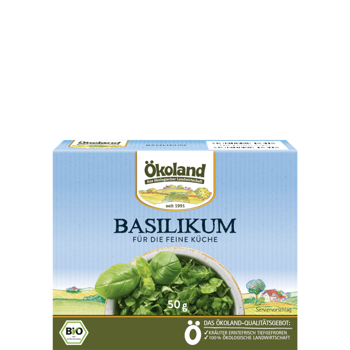 Bio-Basilikum fein geschnitten, streufähig, erntefrisch tiefgefroren in der praktischen, wieder verschließbaren Faltschachtel