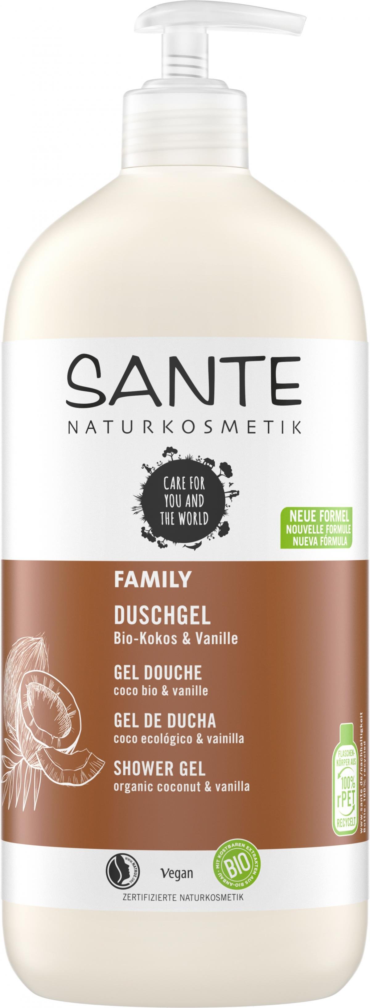 Tropisch-heiter und mild. Mit Bio-Kokos und Bio-Aloe-Vera. Das SANTE FAMILY Duschgel Bio-Kokos & Vanille mit seinem exotisch-warmen Vanilleduft reinigt sanft und gründlich mit ausgewählten Tensiden pflanzlichen Ursprungs. Die wertvolle Pflege-Formulierung mit Bio-Kokosnussextrakt und Bio-Aloe-Vera-Saft spendet intensive Feuchtigkeit und schenkt ein wunderbar weiches Hautgefühl.