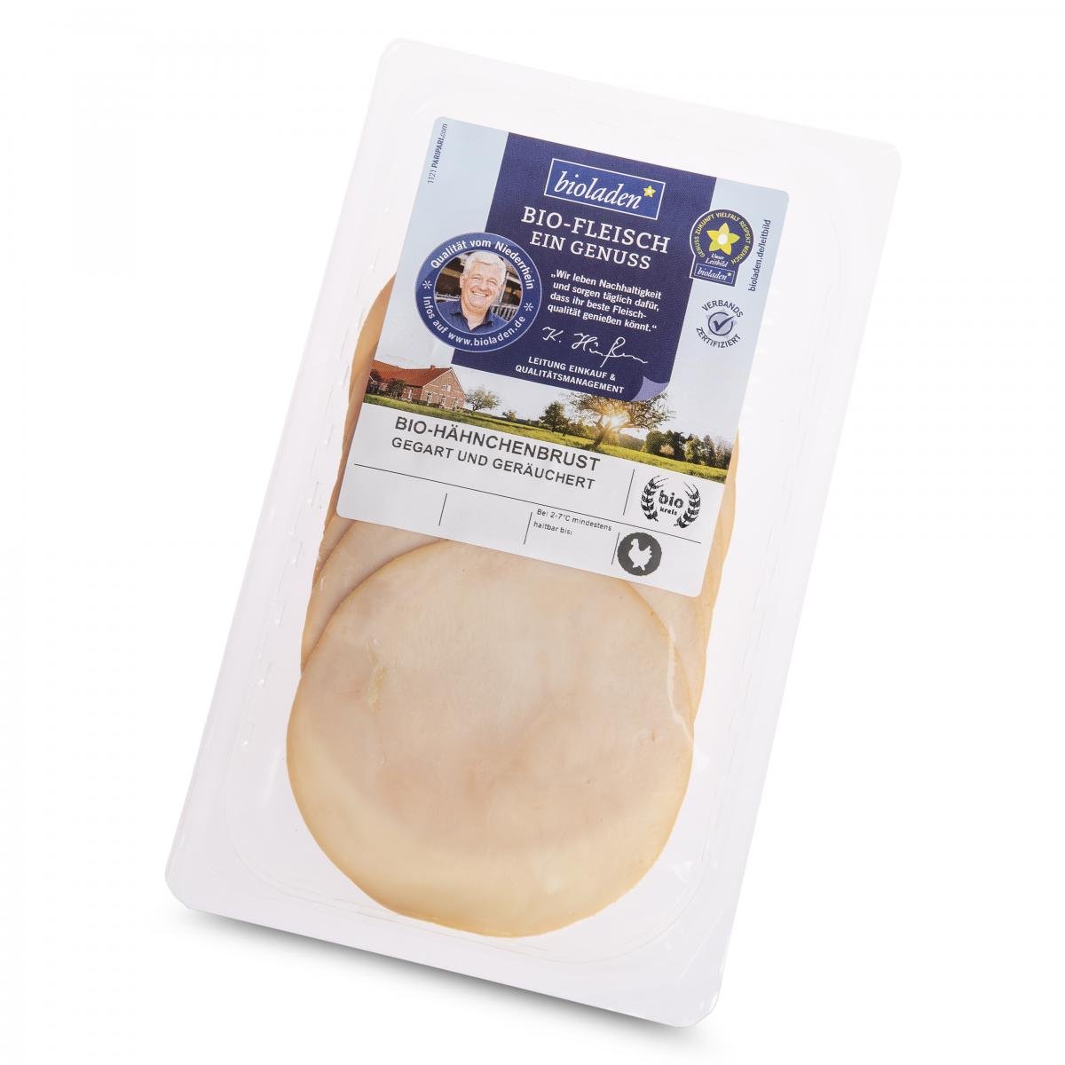 Saftiger Aufschnitt von der Hähnchenbrust, zart im Biss. Die gekochte Hähnchenbrust ist ein handwerklich hergestellter Garschinken aus der Brust mit einem hervorragendem Geflügelaroma und einem feinen Rauchgeschmack, in Scheiben geschnitten. Das Fleisch für dieses bioladen*Produkt stammt von verbandszertifizierten Höfen.