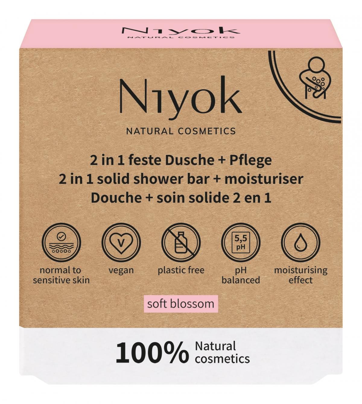 100% Plastikfrei und Naturkosmetik-zertifiziert: Die feste 2 in 1 Dusche von Niyok reinigt die Haut dank milden Natur-Tensiden besonders sanft und spendet dank der speziellen Formulierung reichlich Feuchtigkeit. Der pH-Wert von 5,5 ist hautneutral und schu¨tzt somit die natu¨rliche Barriere der Haut.