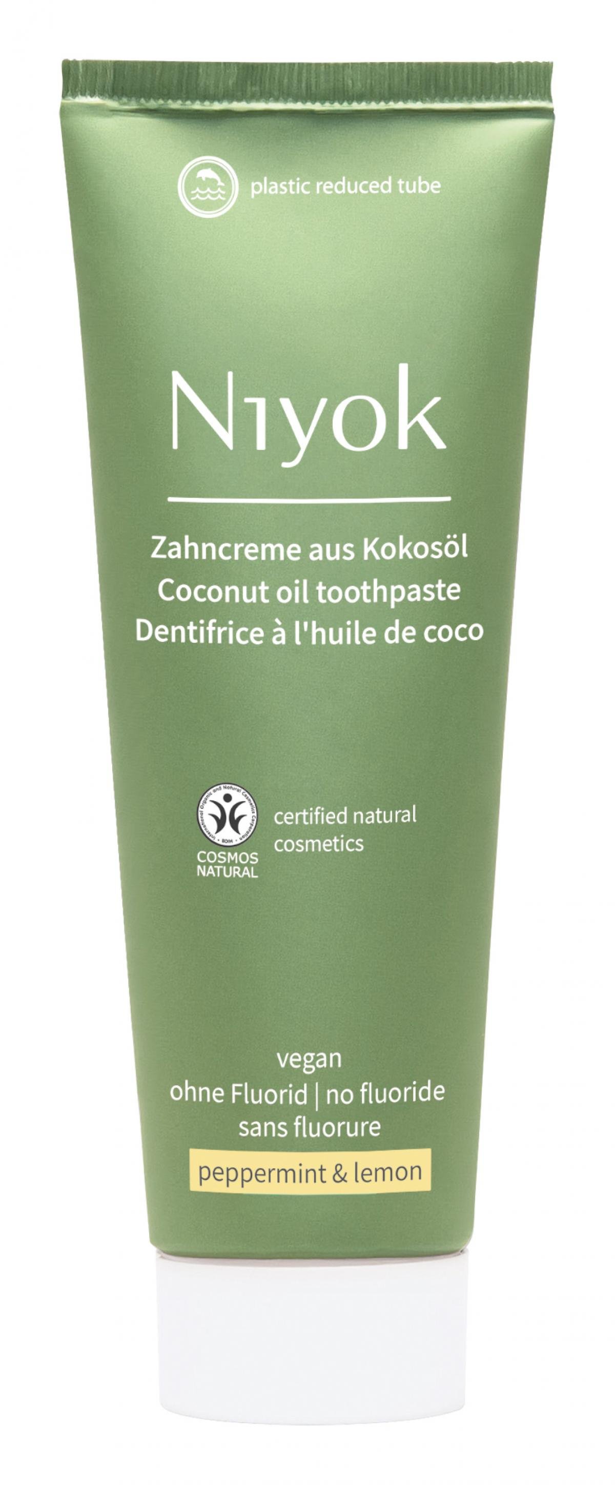 Die natu¨rliche Zahncreme aus Kokosöl von Niyok schu¨tzt Zähne und Zahnfleisch. Hochkonzentriertes Bio-Kokosöl beugt Entzu¨ndungen vor und wirkt anti-bakteriell. Milde Putzkörper aus Calciumcarbonat reinigen die Zahnoberflächen gru¨ndlich und wirken remineralisierend (ohne Fluorid). Xylit komplettiert den Wirkstoffkomplex, indem es Kariesbakterien an der Reproduktion hindert. Verpackt in einer plastikreduzierten Kreide-Tube.