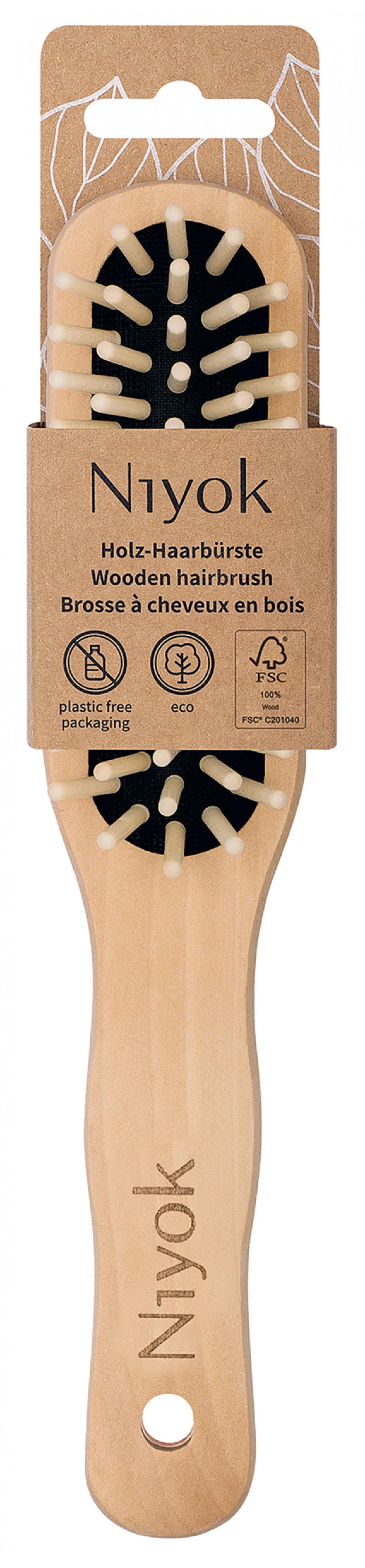 Die Niyok Holz-Haarbürste ist mit ihren Holznoppen perfekt für alle Haartypen und die tägliche Anwendung geeignet.