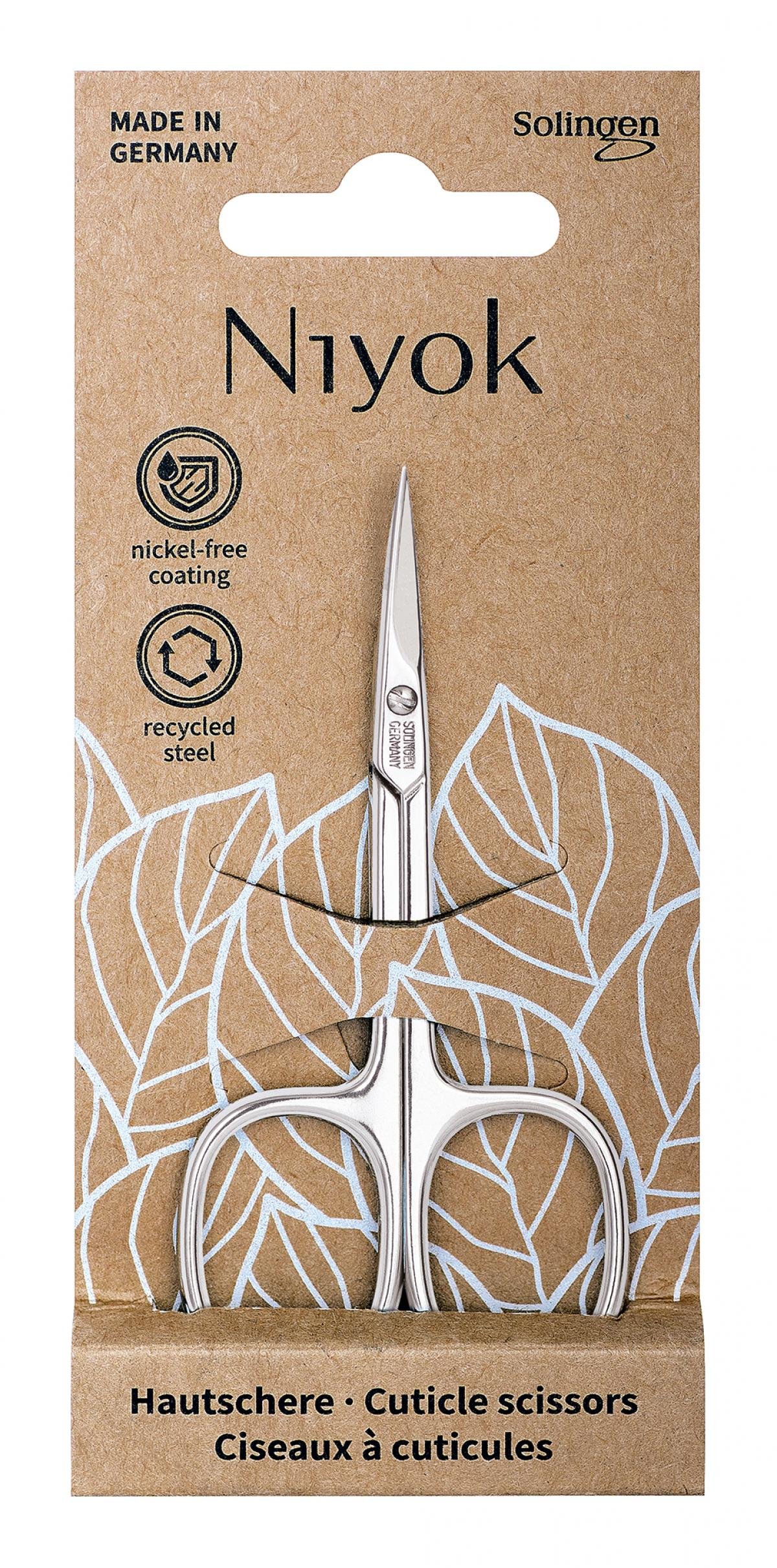Die leicht geschwungenen und von Hand geschliffenen Schneiden der Niyok Hautschere eignen sich perfekt zum Entfernen von Nagelhaut. In Deutschland, Solingen mit nickelfreier Oberfläche hergestellt. Recyclinganteil im Stahl > 80%
