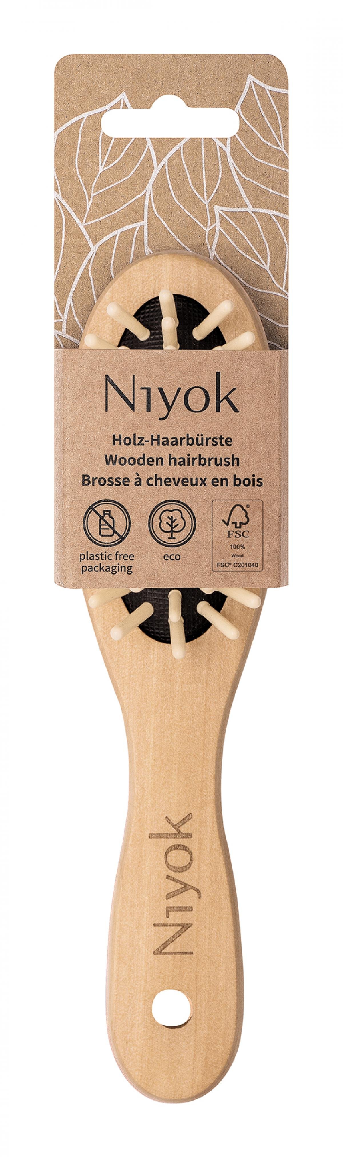 Die Niyok Holz-Haarbürste ist mit ihren Holznoppen perfekt für alle Haartypen und die tägliche Anwendung geeignet.