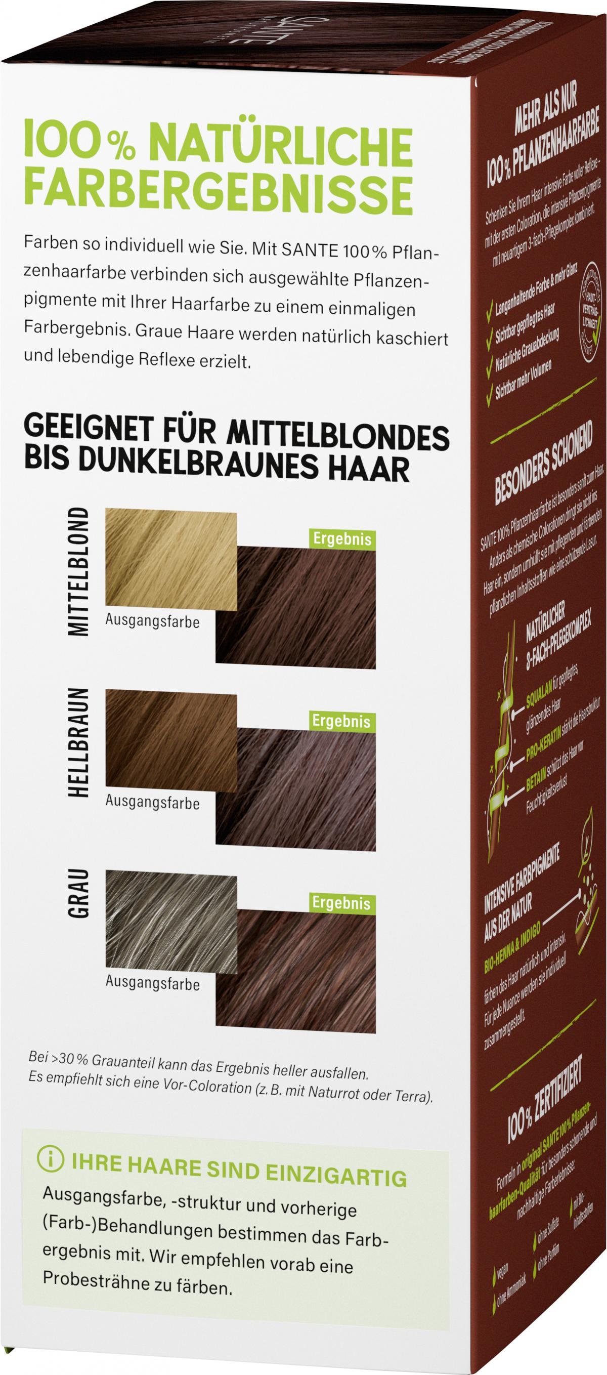 "SANTE 100 % PFLANZENHAARFARBE ist die erste Coloration, die intensive Pflanzenpigmente mit natürlichem 3-fach Pflegekomplex kombiniert. Die innovative Formel mit Squalan, Pro-Keratin und Betain sorgt für strahlende, langanhaltende Farbergebnisse mit natürlicher Grauabdeckung und sofort mehr Glanz. Das Haar ist sichtbar gepflegt bis in die Spitzen und erhält mehr Volumen.